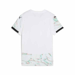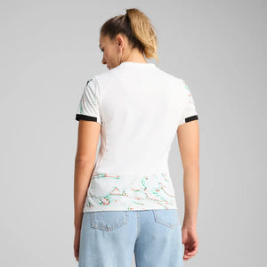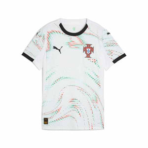 Portugal's 2025-26 away shirt features a clean white base colourway as a futuristic reimagination of the Quinas emblem, taken from the nations coat of arms, covers the jersey in red and green. With bold colours celebrating the intersection of art, technology, and football, the kit is complete with a black crew neck collar.